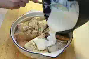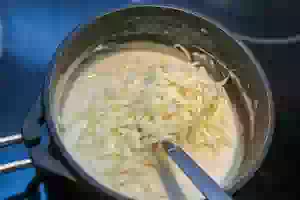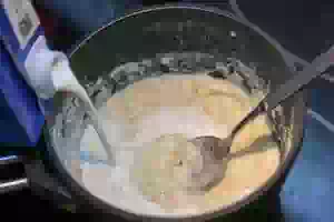 5. Снять сотейник с плиты и влить тонкой струйкой молоко комнатной температуры. Размешать, чтобы не осталось комочков, посолить, приправить молотым мускатным орехом и вернуть на плиту. На небольшом огне довести до кипения, постоянно помешивая, чтобы соус не пригорел.