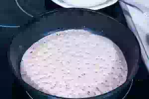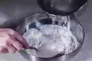 1. Просеять муку и смешать ее с сухими дрожжами. Молоко слегка подогреть (оно должно быть едва теплым). Просеять гречневую и пшеничную муку, соединить вместе. Треть муки смешать с дрожжами, влит теплую воду, добавить сахар и размешать. Миску с опарой поставить в теплое место (например, в миску с горячей водой) и оставить на 30 минут.