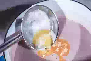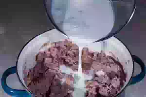 3. Влить в тесто горячее молоко, быстро размешать. Добавить яйца, соль.