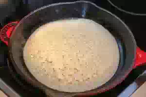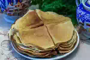 7. Смазать сковороду маслом, прогреть на среднем огне и влить блинное тесто. Если налить совсем тонкий слой теста, то можно печь блины только с одной стороны. Они подойдут, чтобы заворачивать в них начинку и после этого обжаривать. Если влить побольше теста и печь блины потолще, то жарить их надо с двух сторон до румянца. Готовые блины из прокисшего молока складывать стопкой и держать в тепле. Подавать к столу горячими со сметаной, сгущенкой, медом или завернуть в них любую начинку.