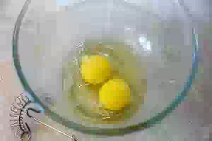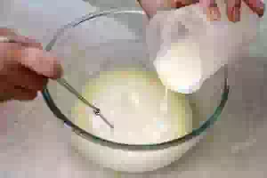 2. Влить в миску с яйцами растительное масло и половину нормы теплого молока. Размешать венчиком.