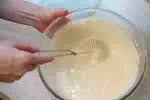 1. В разной посуде слегка подогреть подкисшее молоко и воду. Смешивать их не надо. В отдельной миске растереть венчиком или миксером яйца с сахаром и солью.