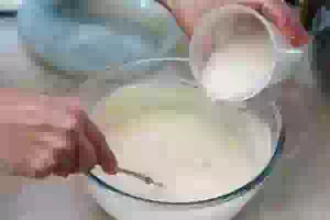 3. Следом начать подсыпать просеянную муку и подливать оставшееся кислое молоко.