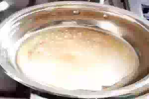 7. Разогреть сковороду. Наливать тесто на сковороду (количество теста зависит от диаметра сковороды, примерно 0,5-0,75 половника) и жарить блины с двух сторон до румяности. Блины жарить на сухой сковороде.