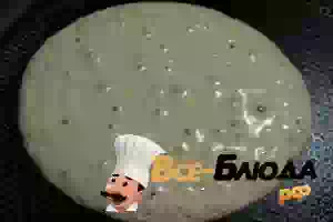 7. Наливаем тесто на разогретую сковороду. После появления пузырьков, переворачиваем блин на другую сторону.
