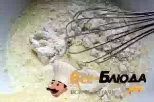 1. Смешаем воду со сметаной, добавим яйца, соль, разрыхлитель и сахар. Взбиваем до однородности. Дальше всыпаем муку и перемешаем. чтоб не было комков.