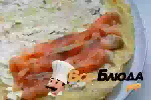 3. Отдельно смешаем плавленный сыр с измельченной зеленью. Каждый блин смажем этой смесью, затем выкладываем кусочки лосося и заворачиваем в рулет.