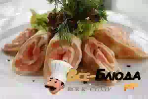 3. Отдельно смешаем плавленный сыр с измельченной зеленью. Каждый блин смажем этой смесью, затем выкладываем кусочки лосося и заворачиваем в рулет.