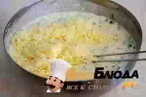 5. Примешать измельченный на мелкой терке сыр. Блинное тесто с сыром готово. Перед жаркой влить в тесто растительное масло и можно печь блины.