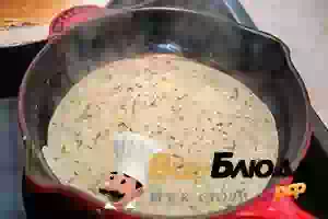 6. Разогреть сковороду, смазать растительным маслом, влить немного теста и равномерно его распределить по дну сковороды. Перевернуть блин, печь до готовности. Сырные блины с зеленью подавать к столу горячими со сметаной или соусом по вкусу.