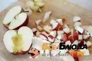 4. Яблоко вымыть, обтереть салфеткой, разрезать пополам и вырезать сердцевину. Затем порезать маленькими кубиками или тонкими пластинками.