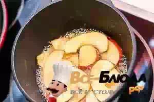 7. Когда панкейки будут готовы, приготовить для подачи яблоки в карамели. Для этого 1-2 яблока порезать тонкими ломтиками. В небольшом сотейнике разогреть кусочек сливочного масла, добавить яблоки и посыпать их сахаром. Прогреть яблоки в смеси сахара со сливочным маслом, пока они не станут мягкими, но не начнут разваливаться. Готовые карамелизированные яблочные дольки подавать вместе с панкейками.