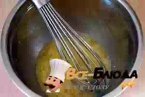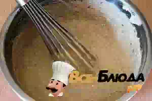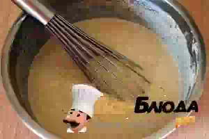 2. Добавить половину сыворотки и всю муку, тщательно перемешать. Так в тесте не будет комочков.