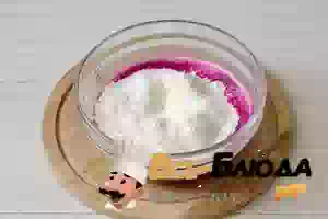 2. Наливаем в миску со свеклой подогретую до комнатной температуры сыворотку, добавляем в нее соду, сахар и соль. Хорошо перемешиваем все ингредиенты венчиком. Масса немного вспенится, поскольку сыворотка и сода вступят в реакцию.