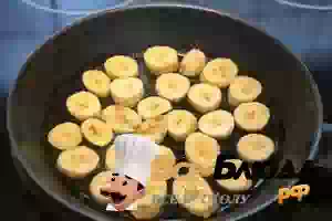 1. В сковороде разогреть совсем не много масла (можно смесь сливочного и растительного), выложить в один слой кругляшки банана и обжарить их с двух сторон до появления характерной сахарной корочки.
