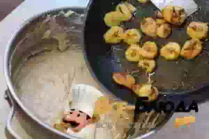 9. Спустя 30 минут в густое, тягучее тесто для оладий по частям примешать бананы в карамели.