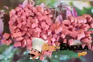 4. Очистите от плёнки сосиски и покрошите их мелкими кубиками.
