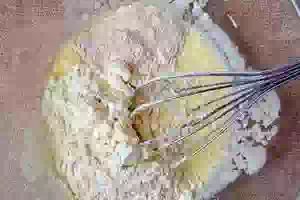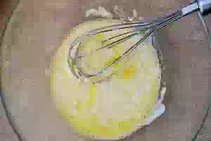 1. Подготовьте ингредиенты для оладий. Венчиком взбейте яйцо в миске.