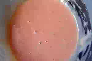 4. Хорошо перемешайте до получения однородной массы. Можете использовать миксер, так как протеин плохо смешивается и образует комочки. Консистенция теста для оладий должна быть как у сметаны. В этом рецепте протеин клубничный, поэтому цвет теста получился розовый и аромат соответствующий.