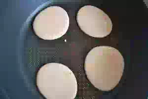 5. На сухую сковороду с антипригарном покрытием столовой ложкой выкладывать тесто и обжаривать с двух сторон. Можете жарить оладьи и с добавлением масла, но лишние калории нам не нужны.