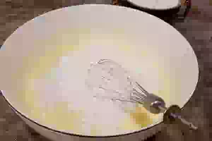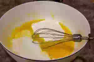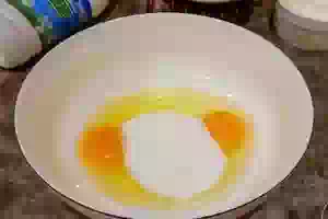 1. В миске подходящего объема смешать венчиком яйца с ванильным и обычным сахаром.