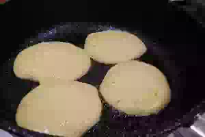 5. Разогреть сковороду, смазать ей небольшим количеством растительного масла и столовой ложкой выкладывать тесто. Жарить оладьи с двух сторон до румянца. Огонь под сковородой должен быть небольшой, чтобы оладьи успели пропечься внутри, распушиться и не сгореть снаружи. Оладьи на кефире и сметане готовы.