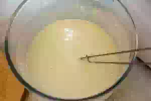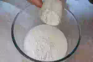 1. В миску подходящего размера налить кефир. Добавить просеянную муку и перемешать венчиком или миксером, чтобы не осталось комочков.