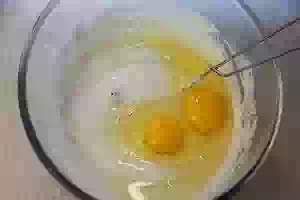 2. Добавить яйца. Всыпать сахар и соль. Перемешать до однородности. В конце замешивания добавить соду и снова перемешать. Оставить миску с тестом для оладий в сторону, пока будем готовить наполнитель - бекон с луком и сыром.
