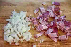 3. Сыр измельчить на крупной терке. Лук мелко порубить. Бекон порезать маленькими тонкими кусочками.