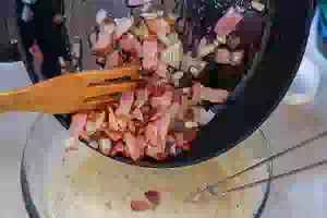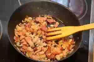 5. В сковороде разогреть 1 ст.л. растительного масла, добавить репчатый лук и пассеровать, помешивая, до мягкости лука. Добавить к луку кусочки бекона и обжаривать все вместе, пока бекон хорошо не подрумянится. Снять сковороду с беконом и луком с плиты, чтобы наполнитель для оладий остыл.