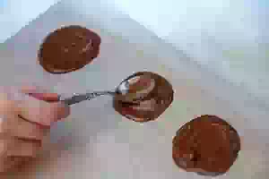 1. Сначала надо приготовить медальоны из нутеллы, которые и будут начинкой для оладий. Для этого застелить разделочную доску пекарской бумагой и выкладывать на неё 7 кружков Нутеллы примерно по 1-1.5 ст.л. на каждый. Диаметр кружков должен быть около 6 см. Убрать доску с медальонами в морозилку на 1 час. Шоколадная паста должна полностью застыть.