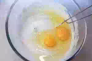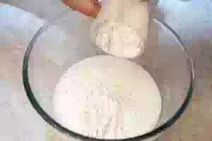 2. Пока замораживается нутелла, приготовить тесто для оладий. Для этого просеять муку в миску и смешать её с пекарским порошком. Смешать муку с молоком, чтобы не осталось комочков.