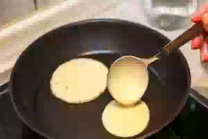 5. Сковороду с антипригарным покрытием разогреть, смазать растительным или сливочным маслом, а затем протереть бумажным полотенцем. Снизить нагрев до среднего. Налить на сковороду теста для 2-3 оладий и дать им пропечься примерно 30 секунд.