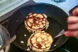 7. Сразу залить медальоны тесто и подождать, пока оладий снизу пропечется. Для этого достаточно приподнять край оладий лопаточкой и посмотреть.