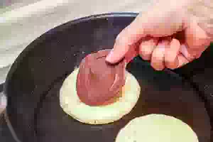 6. Как только тесто на поверхности оладий слегка схватится, достать из морозилки 2-3 (в зависимости от числа оладий на сковороде) замороженных медальона из нутеллы (они легко отделяются от бумаги) и положить их на оладьи. Остальные медальоны должны оставаться в морозилке!
