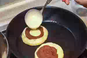 8. Перевернуть оладьи и печь до готовности с обратной стороны. Повторить все то же самое с остальными замороженными медальонами из шоколадной пасты и тесто. У вас получится 7 оладушек с секретом - с прослойкой шоколада внутри. Оладьи с нутеллой внутри подавать сразу же. Пока они горячие.