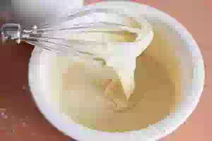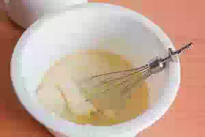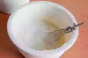 1. Заранее достаем из холодильника сливочное масло и оставляем его при комнатной температуре, чтобы оно согрелось и стало мягким. Выливаем в миску сгущённое молоко. Добавляем к нему яйца и хорошенько перемешиваем ингредиенты венчиком или миксером на низкой скорости.