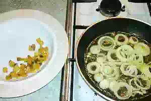 3. Отдельно приготовить шкварки из сала и пожарить нарезанный кольцами лук. Готовые ржаные оладьи на сметане и кефире переложить на тарелку, посыпать шкварками и кольцами жареного лука. Подавать к столу горячими.