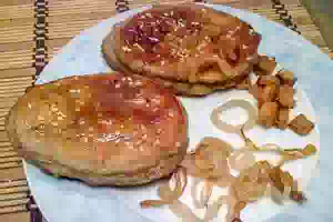 3. Отдельно приготовить шкварки из сала и пожарить нарезанный кольцами лук. Готовые ржаные оладьи на сметане и кефире переложить на тарелку, посыпать шкварками и кольцами жареного лука. Подавать к столу горячими.