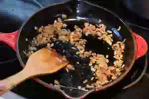2. В сковороде разогреть растительное масло и обжарить до румяности лук. Жареный лук переложить на тарелку, даль ему остыть.