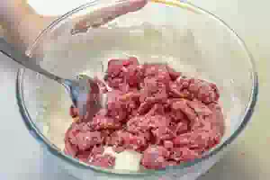 6. Небольшими порциями примешать в тесто мясной фарш.