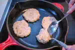 8. Разогреть сковороду, смазать растительным маслом и выкладывать столовой ложкой тесто с мясным фаршем и тертой тыквой. Будет проще это делать, если сначала ложку намочить в холодной воде. Прикрыть сковороду с мясными оладьями крышкой и жарить на слабом огне сначала с одной стороны, затем перевернуть и продолжить жарить с другой стороны до золотистой корочки. Готовые мясные оладьи с тыквой из теста на кефире подавать горячими или остывшими как гарнир или закуску.
