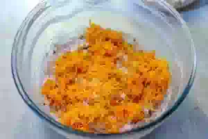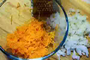 1. Подготовить овощи, которые будем добавлять в мясной фарш для оладий. Очищенную тыкву натереть на мелкой терке. Лук очистить и мелко нарезать.