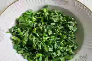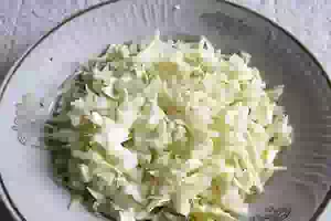1. Для приготовления оладий с капустой и зелёным луком капусту нашинкуйте как можно тоньше. Сложите её в тарелку, слегка посолите, а затем немного помните, чтобы она стала мягче.