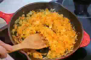 4. Пока тесто для печеночных оладий стоит на расстойке, подготовить овощную пассеровку. Для этого морковь и лук очистить. Лук мелко порубить, морковь натереть на крупной терке. В сковороде разогреть растительное масло, добавить овощи и пассеровать, помешивая лопаткой, до мягкости овощей. Дать пассированным овощам остыть
