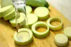 6. Молодые кабачки вымыть, обтереть досуха и разрезать на шайбочки толщиной коло 2 см. Из каждой шайбочки вырубкой для печенья или рюмкой вырезать серединку. У нас получатся колечки шириной по краям примерно 1 см. Обвалять эти колечки в муке с солью.