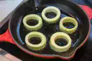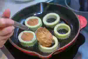 7. В сковороде разогреть растительное масло и выложить колечки из кабачков. Сразу уменьшить нагрев до минимального.