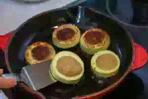 8. В серединку кабачкового кольца положить 1 ст.л. печеночного фарша. Прикрыть сковороду крышкой и жарить печеночные оладьи в кабачках примерно 5 минут. Вы увидите, что фарш в кабачках станет заметно светлее и плотнее.