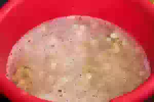 1. В миску подходящего объема насыпать половину нормы овсяных хлопьев и залить 150 мл кипятка. Отставить в сторону, пока будете подготавливать остальные продукты для постных овсяных котлет.