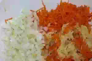 2. Вымыть, почистить овощи. Лук нарезать небольшим кубиком. Картофель, морковь и чеснок натереть на мелкой терке. Всё это сложить в одну миску.